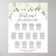 This beautiful boho chic wedding seating chart has room for 130 names at 13 tables with 10 seats per table. The rustic hand painted watercolor design features roses, blossoms, and flowers in shades of ivory, white, or cream, along with sage green eucalyptus leaves and garden foliage. The title reads "Welcome! please find your table" written in elegant script calligraphy. Wonderful way to help your guests find their seats while making your wedding reception more beautiful.