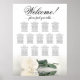 This elegant wedding seating chart has 13 tables and showcases a romantic and sophisticated design featuring a single long-stemmed ivory, white, or cream colored rose lying on its side and reflecting in a pool of water. With seating arrangements for 130 guests and 10 seats per table, this chart provides ample space for your guests to locate their seats with ease. The title, "Welcome! please find your table," is written in elegant script calligraphy, while there is space available for the names of the couple and the wedding date at the bottom. This chart is an excellent way to add beauty, class, and style to your wedding reception, while also assisting guests in finding their seats.