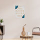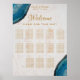 The wedding seating chart has 13 tables. In the corners, up left and down right, there are blue agate geodes. The background is white marble. The names of the bride and groom are written in an elegant calligraphic script . All text has a golden color.