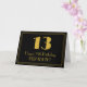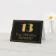 This vintage look and Roaring '20s inspired birthday greeting card design features a large art deco style inspired number "13", the message "Happy 13th Birthday,", an editable name, and a border pattern consisting of thin lines on the front. The background of the front is colored black. The inside has a customizable birthday greeting message, or could perhaps be cleared and left blank if a message is to be written by hand instead. A personalized birthday greeting card like this might be used to acknowledge somebody’s thirteenth birthday. [~Z0000463]