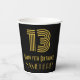 This 1920s-1930s style inspired and vintage look birthday-themed paper cup design features a large art deco inspired style number “13”, along with the birthday greeting message “Happy 13th Birthday,” and a customizable name. The background is colored black. Vintage look birthday themed paper cups like this might be used at a party for somebody who is celebrating their 13th birthday. [~Z0000546]