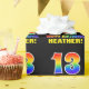 This fun, cheerful, and colorful birthday wrapping paper design features a large number "13" and the message "HAPPY BIRTHDAY,", both having a rainbow spectrum gradient inspired pattern coloring, along with a bold yellow custom recipient name. The background is colored black. Fun birthday themed wrapping paper like this might be used when giving a gift or present in celebration of somebody’s thirteenth birthday. [~Z0000475]
