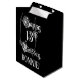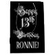 This luxurious and formal birthday gift bag design features the message “Happy 13th Birthday,” in opulent script style text, on a black colored background. It also has a personalized recipient name. A giftbag like this might be used when wrapping gifts being given to somebody in celebration of their 13th birthday. [~Z0000557]
