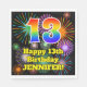 This exciting and fun birthday paper napkin design features a large number “13” with a colorful rainbow spectrum gradient inspired pattern, along with the message “Happy 13th Birthday,”, and an editable name. The background features a colorful pattern inspired by the look of bursting celebratory fireworks. Colorful paper napkins like this might be fun to use at a party held in honor of somebody’s 13th birthday. [~Z0000574]