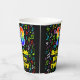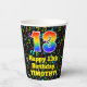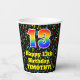 This exciting and cheerful music themed birthday paper cup design features a large number “13” with a rainbow spectrum gradient inspired pattern, along with the message “Happy 13th Birthday,”, and a personalized name. The background features a multicolored pattern having music notes and symbols of various sizes and colors. Vibrant, colorful paper cups like this might be fun to use at a birthday celebration/party being held to celebrate somebody’s 13th birthday. [~Z0000541]