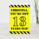The front of this fun and attention-grabbing birthday themed greeting card design features an editable name and the message "YOU’RE NOW 13 YEARS OLD!" in black stencil style text on a yellow colored background. There is also an eye-catching black and yellow stripes pattern at the top and bottom edges of the front. The inside features a customized birthday greeting message, or could perhaps be cleared and left blank if a message is to be written by hand instead. A customizable birthday card like this might be a fun way to send birthday wishes to somebody who is celebrating their thirteenth birthday. [~Z0000413]