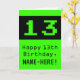 The front of this nerdy and fun birthday-themed greeting card design features a large green vintage computer game style number "13". It also features the birthday greeting message "Happy 13th Birthday,", and a personalized name. The inside features a customizable birthday greeting message, or could perhaps be cleared and left blank if a message is to be written by hand instead. A geeky customizable birthday card like this might be a fun way to send birthday wishes to somebody who is celebrating their thirteenth birthday. [~Z0000430]
