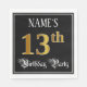 This fancy and luxurious birthday paper napkin design features an editable name and the message “13th Birthday Party”. The large number “13th” has an imitation/faux gold-inspired coloring pattern, and the words “Birthday Party” are in elegant script-style text. The background is colored black by default (although it can be customized). Ornate, elegant paper napkins like this might be useful at a birthday party being held in celebration of somebody’s 13th birthday. [~Z0000565]