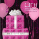 A modern mix of casual, script and serif typography in a fun combination of pinks makes a festive 13th birthday wrapping paper that you can customize for any name.