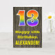 The front of this colorful yet rustic birthday-themed greeting card design features a large number "13" with a rainbow spectrum gradient inspired pattern, along with the message "Happy 13th Birthday,", and a personalized recipient name. The background of the front of the card features a rustic faux wood grain style pattern. The inside features an editable birthday greeting message, or could perhaps be cleared and left blank if a message is to be written by hand instead. A custom birthday card like this might be a fun way to send birthday wishes to somebody who is celebrating their thirteenth birthday. [~Z0000419]