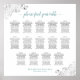 This beautiful wedding seating chart includes table assignments for 140 guests at 14 tables. The simple yet elegant design features dark gray and teal or turquoise text on a white background with a lacy script calligraphy title. The corners are decorated with a frilly silver faux foil filigree with curls and swirls. Stylish, chic and sophisticated way to help your guests find their seats at your reception.