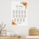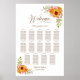 This yellow and pink floral seating chart will help your guests find their table. It is suitable for a wedding with 14 tables and up to 140 guests.
