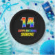 This colorful, cheerful, and fun birthday themed paper plate design features a large number "14" and the message "HAPPY BIRTHDAY,", both having a rainbow spectrum gradient inspired pattern coloring, along with a bold yellow customizable name. It has a black colored background. Fun, customizable birthday themed paper plates like this might be used at somebody’s 14th birthday party. [~Z0000488]