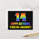 The front of this colorful, cheerful, and fun birthday themed postcard design features a large number "14" and the message "HAPPY BIRTHDAY,", both having a rainbow spectrum gradient inspired pattern coloring, along with a bold yellow personalized recipient name. The front also has a plain black colored background. The back of the postcard features an editable birthday greeting message, or could perhaps be cleared and left blank if a message is to be written by hand instead. An exciting customizable birthday postcard like this might be a fun way to acknowledge somebody’s fourteenth birthday. [~Z0000474]