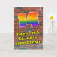 This exciting and fun urban street art and graffiti themed birthday greeting card design features a large number “14” having a colorful rainbow spectrum gradient inspired pattern. It also features the message “Happy 14th Birthday,”, and an editable name. The background of the front features a brick wall pattern. The inside has a personalized birthday greeting message, or could perhaps be cleared and left blank if a message is to be written by hand instead. A vibrant, customized birthday greeting card like this might be used to acknowledge somebody’s fourteenth birthday. [~Z0000586]