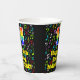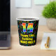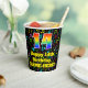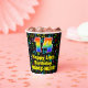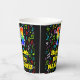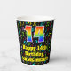 This joyful and fun music-themed birthday paper cup design features a large number “14” with a rainbow spectrum gradient inspired pattern, along with the message “Happy 14th Birthday,”, and an editable name. The background features a multicolored pattern of various music notes and symbols having a variety of sizes and colors. Vibrant, colorful paper cups like this might be fun to use at a birthday party being held to celebrate somebody’s 14th birthday. [~Z0000541]