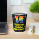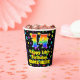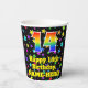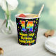 This exciting and joyful birthday themed paper cup design features a large number “14” with a rainbow spectrum gradient inspired pattern, along with the message “Happy 14th Birthday,”, and a customizable name. The background features a colorful pattern featuring many star shapes with different colors and sizes. Vibrant, colorful paper cups like this might be fun to use at a birthday party/celebration being held in celebration of somebody’s 14th birthday. [~Z0000540]