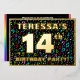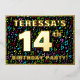 The front of this eye-catching and exciting fourteenth birthday celebration foil invitation card design features a customizable name, a large number “14th”, the message “BIRTHDAY PARTY!”, and a border. The background of the front has a joyful, multicolored music notes and symbols pattern. The back features personalized details about the event, such as the date, time, location/venue, and any other important information. Personalized invitations like these might be a fun way to invite attendees to a birthday party being held to honor somebody’s 14th birthday. These might be extra special if that person is a singer, a composer, a musician, a songwriter, or otherwise loves music. [~Z0000601]