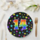 This cheerful, fun, and colorful paper plate design features a large number "14" colored with a rainbow spectrum gradient inspired pattern. The background features a pattern of colorful star shapes. Fun paper plates like this might be used at a celebration being held to observe somebody’s fourteenth birthday, or a couple’s 14th anniversary, or some other 14th event. [~Z0000493]