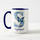 A personalized coffee mug in shades of Blue with coordinating butterfly, featuring the letter "A" monogram. Easily customize it with your name or create a unique gift for your loved ones. Enough room to add an additional quote or message or even a background. This mug also come in different styles and color combinations. Browse the collection to see examples of this font type on the different cup styles and sizes.