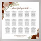 This 15 table wedding seating chart features a beautiful boho chic floral design with hand painted watercolor roses, eucalyptus leaves and garden foliage in autumn shades of coral peach, rust orange, and burnt umber. There is an elegant script calligraphy title and seating assignments for 150 people with 10 seats per table, with space for the names of the couple and wedding date at the bottom. Wonderful way to make it easy for your guests to find their tables.