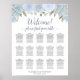 This stunning 15 table wedding seating chart exudes rustic floral boho chic charm, featuring a lavish border of hand-painted watercolor roses, blossoms, and foliage in shades of dusty blue and sage green. The title, "Welcome! please find your table" is written in elegant script calligraphy, making it a visually pleasing and functional way to guide guests to their seats during the reception. The chart also features space for the couple's names and their wedding date. It can accommodate a total of 150 guests with 10 seats per table.