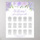 This beautiful 15 table wedding seating chart features a rustic floral boho chic design with a bevy of hand painted watercolor roses, blossoms, and flowers in shades of dusty purple, lavender, and lilac, along with sprigs of eucalyptus leaves and garden greenery. The elegant script calligraphy title reads "Welcome! please find your table" and there is space for the names of the couple and wedding date at the bottom. This chart has table assignments for 150 guests with 10 seats per table. Wonderful way to add beauty, style, and charm to your wedding reception while making it easy for your guests to find their seats.