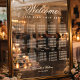 All text is white. The word Welcome is written in an elegant calligraphic script, the rest in caps. The tables are on 3 rows. Above them and under the word Welcome, there is the message "Please find your seat!".