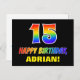The front of this fun, cheerful, and colorful birthday postcard design features a large number "15" and the message "HAPPY BIRTHDAY,", both colored with a rainbow spectrum gradient inspired pattern, along with a bold yellow personalized recipient name. The front also features a plain, minimalist, black colored background. The back of the postcard features a personalized birthday greeting message, or could perhaps be cleared and left blank if a message is to be written by hand instead. A cheerful customizable birthday postcard like this might be a fun way to celebrate somebody’s fifteenth birthday. [~Z0000474]