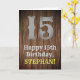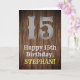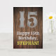 This country look and western inspired birthday greeting card design features a large rustic inspired number "15", the message "Happy 15th Birthday,", a custom name, and a faux/imitation wood grain inspired style pattern background. The inside has a customizable birthday greeting message, or could perhaps be cleared and left blank if a message is to be written by hand instead. A customized birthday greeting card like this might be used to acknowledge somebody’s fifteenth birthday. [~Z0000469]