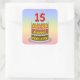 This colorful and upbeat birthday-themed square sticker design features a cartoon-style depiction of a three-tier birthday cake having numeral-shaped candles on top showing the number “15“, along with the message “HAPPY 15TH BIRTHDAY,”, and a personalized recipient name. The background has a multi-color pastel rainbow spectrum inspired gradient pattern. Stickers like these might be distributed or used at a party held for somebody who is celebrating their 15th birthday, or perhaps used when preparing invitations or wrapping presents/gifts for such an event. [~Z0000624]