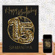 Personalized 15th birthday card with animal print foil balloons in black and gold. The trendy leopard print balloons are framed with black and gold confetti and Happy Birthday is hand lettered in gold. The template is ready for you to personalize the front of the card and add a message inside - or you can leave the inside blank if you prefer to handwrite on arrival.