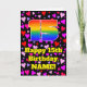 The front of this colorful and fun birthday-themed greeting card design features a large number “15” with a rainbow spectrum gradient inspired pattern, along with the message “Happy 15th Birthday,”, and a personalized name. The background of the front features a pattern of pink, purple, and red heart shapes of various sizes. The inside has a customized birthday greeting message, or could perhaps be cleared and left blank if a message is to be written by hand instead. A loving, customized birthday greeting card like this might be a fun way to send birthday greetings to somebody who is celebrating their fifteenth birthday. [~Z0000551]