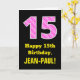 This joyful and fun birthday-themed greeting card design features a large number "15" with a light pink and dark pink stripes pattern containing heart shapes on the front. The front also features the birthday greeting message "Happy 15th Birthday,", and a personalized recipient name. The inside features a custom birthday greeting message, or could perhaps be cleared and left blank if a message is to be written by hand instead. A custom birthday card like this might be a fun way to send birthday wishes to somebody who is celebrating their fifteenth birthday. [~Z0000434]