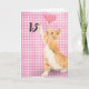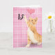 Gold tabby cat with pink heart balloon for 15th birthday on pink and white gingham background.