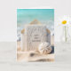 A beautifully embossed wedding invitation card rests inside an envelope on the sand near the ocean's edge, accompanied by a sand dollar for a 15th wedding anniversary.