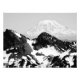 A black and white photograph of Mount Rainier with a rugged mountain range in the foreground. Image Copyright ©2023 Kimberly J Tilley. zazzle.com/store/developingnature