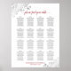 This beautiful wedding seating chart includes table assignments for 160 guests, with 10 people at each table. The design is simple yet elegant with dark gray and red text on a white background and features lacy silver faux foil filigree in the corners with fancy script calligraphy reading "please find your table." Sophisticated and chic.