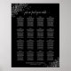 This beautiful wedding seating chart includes table assignments for 160 guests, with 10 people at each table. The design is simple yet elegant with pale gray text on a black background and features lacy silver faux foil filigree in the corners with fancy script calligraphy reading "please find your table." Sophisticated and chic.