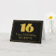 This Roaring '20s era inspired and vintage appearance birthday-themed greeting card design features a large art deco look inspired number "16", the message "Happy 16th Birthday,", a custom name, and a border pattern consisting of thin lines on the front. The background of the front is colored black. The inside has an editable birthday greeting message, or could perhaps be cleared and left blank if a message is to be written by hand instead. A personalized birthday greeting card like this might be used to acknowledge somebody’s sixteenth birthday. [~Z0000498]