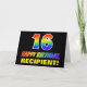 The front of this colorful, cheerful, and fun birthday greeting card design features a large number "16" and the message "HAPPY BIRTHDAY,", both colored with a rainbow spectrum gradient inspired pattern, along with a bold yellow customizable recipient name. The front also features a minimal black colored background. The inside has a custom birthday greeting message, or could perhaps be cleared and left blank if a message is to be written by hand instead. A cheerful customizable birthday card like this might be a fun way of acknowledging somebody’s sixteenth birthday. [~Z0000472]