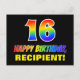 The front of this fun, cheerful, and colorful birthday-themed postcard design features a large number "16" and the message "HAPPY BIRTHDAY,", both having a rainbow spectrum gradient inspired pattern coloring, along with a bold yellow customizable recipient name. The front also features a plain black colored background. The back of the postcard has a customized birthday greeting message, or could perhaps be cleared and left blank if a message is to be written by hand instead. An exciting birthday postcard like this might be a fun way to send birthday wishes to somebody who is celebrating their sixteenth birthday. [~Z0000474]