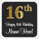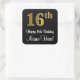 This stylish, luxurious, and elegant birthday-themed square sticker design features a large ordinal number “16th” having a faux/imitation gold-like look, along with the birthday greeting message “Happy 16th Birthday,” and a customizable name in a script-style font. The background is colored black. Elegant stickers like this may be used when wrapping a birthday present or gift being given to somebody who is celebrating their 16th birthday, or perhaps may be handed out to the guests at a birthday party or celebration. [~Z0000517]