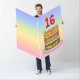 This upbeat and cheerful birthday-themed greeting card design features a cartoon-style depiction of a three-tier birthday cake having numeral-shaped candles on top showing the number “16“, along with the message “HAPPY 16TH BIRTHDAY,”, and a customizable recipient name. The background of the front features a multicolored pastel rainbow spectrum inspired gradient pattern. The inside has a custom birthday greeting message, or could perhaps be cleared and left blank if a message is to be written by hand instead. A joyful, personalized birthday greeting card like this might be used to celebrate somebody’s sixteenth birthday. [~Z0000626]