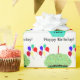 Fun 16th birthday or any age. Green frosting chocolate cupcake with sprinkles in light blue pleated cupcake wrapper and festive red white candle with colorful flicker flame. Colorful flying balloons adorn wrapping paper in red, blue, orange, green, yellow. With the wording, Happy Birthday written in black typography at bottom of cupcake. Original Artwork by TamiraZDesigns.