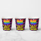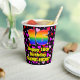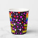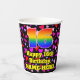 This cheerful and colorful birthday-themed paper cup design features a large number “16” with a rainbow spectrum gradient inspired pattern, along with the message “Happy 16th Birthday,”, and a personalized name. The background features a pattern of purple, pink, and red heart shapes of various sizes. Upbeat, happy paper cups like this might be fun to use at a birthday celebration/party being held to celebrate somebody’s sixteenth birthday. [~Z0000548]