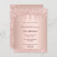 A modern, stylish and glamorous invitation for a girl's Sweet 16th birthday party. A faux rose gold metallic looking background with an elegant rose gold and pink faux glitter drip, paint dripping look. The name is written with a modern dark rose gold colored hand lettered style script. Personalize and add your party details.
