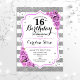 16th Birthday - Silver White Stripes Purple Roses Invitation