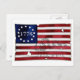A postcard rendition of a tattered old American flag from the American Revolution featuring 13 stars and stripes. "Join or Die" is imprinted on the flag. A patriotic emblem.