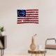 A rendition of a tattered old American flag from the American Revolution featuring 13 stars and stripes. "Join or Die" is imprinted on the flag. A patriotic emblem.